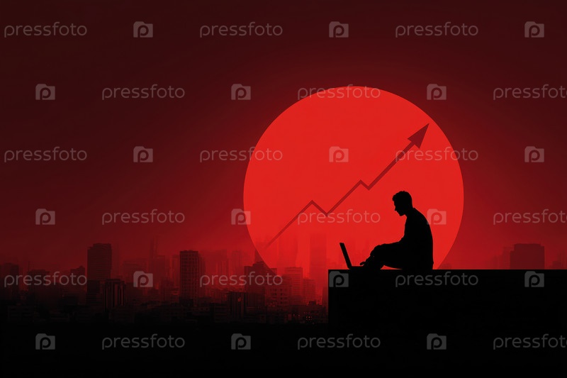 Силуэт молодого взрослого мужчины, использующего ноутбук с графиком поднимающейся стрелки