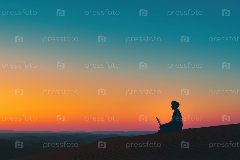 Молодой взрослый мужчина сидит на песчаной дюне, используя ноутбук во время яркого захода солнца