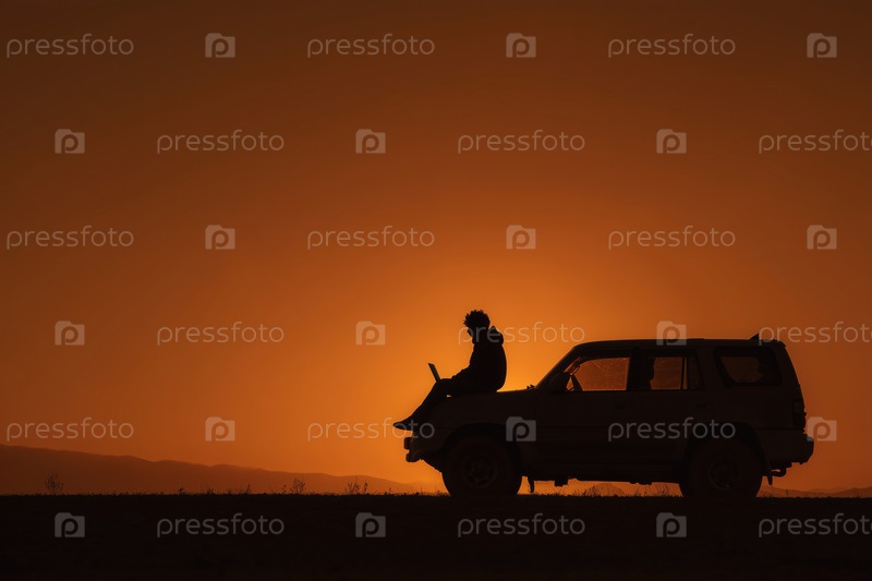 Силуэт молодого взрослого мужчины, использующего ноутбук на внедорожнике во время Sunset Outdoors