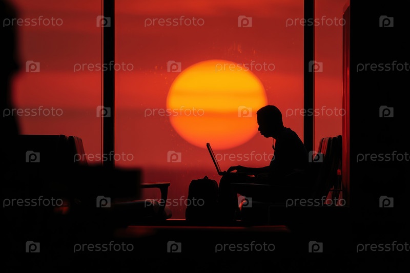 Молодой взрослый мужчина использует ноутбук в аэропорту во время яркого захода солнца