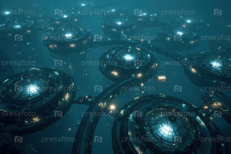 Футуристические подводные городские структуры, освещающие глубины океана ночью