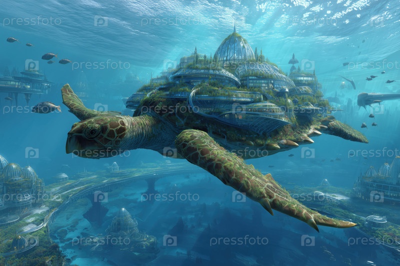 Гигантская морская черепаха плавает под водой с футуристическими городскими структурами на Shell