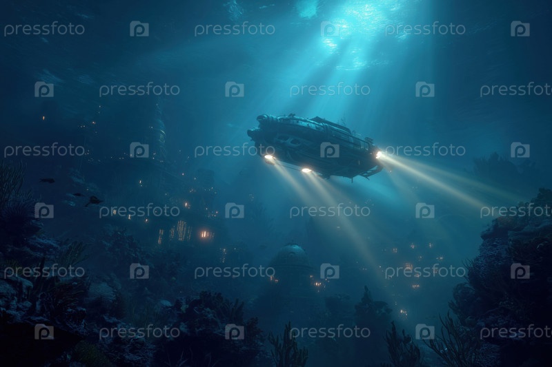Подводная лодка исследует древний подводный город, освещенный лучами солнечного света