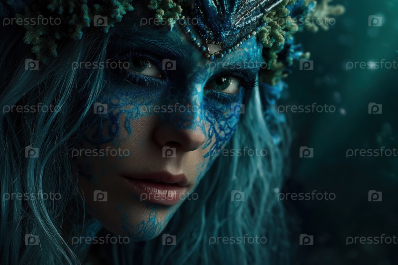 Портрет молодой взрослой женщины, носящей макияж синей фантазии и пристально глядящей