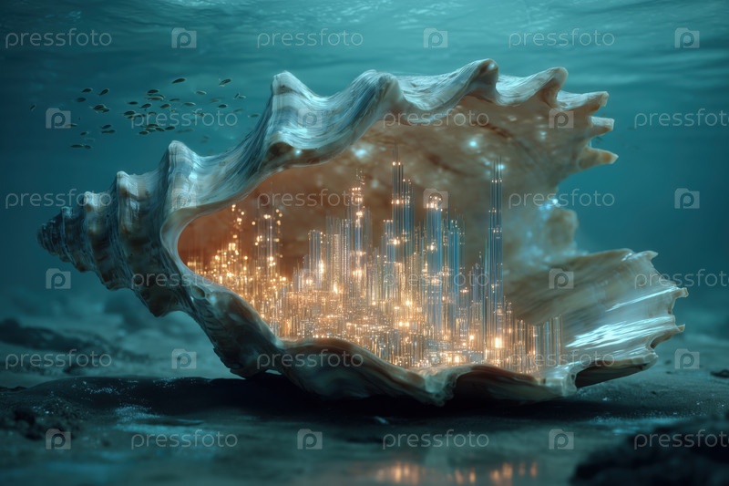 Футуристический городской пейзаж, возникающий внутри гигантского раковины подводной среды