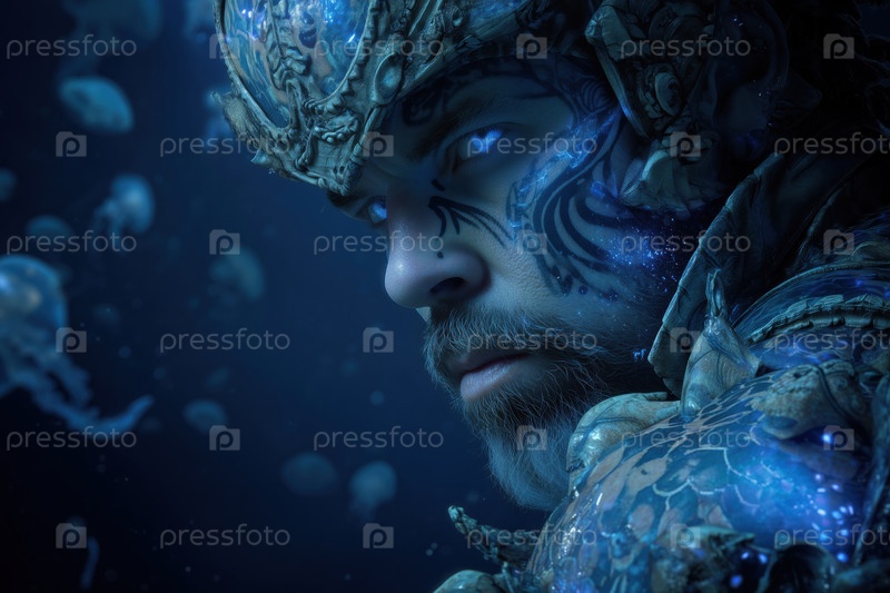 Портрет молодого взрослого мужчины в украшенной броне под водой, пристально глядящего