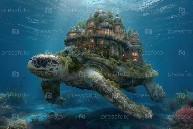 Гигантская морская черепаха плавает под водой, неся фэнтезийный город на своей раковине
