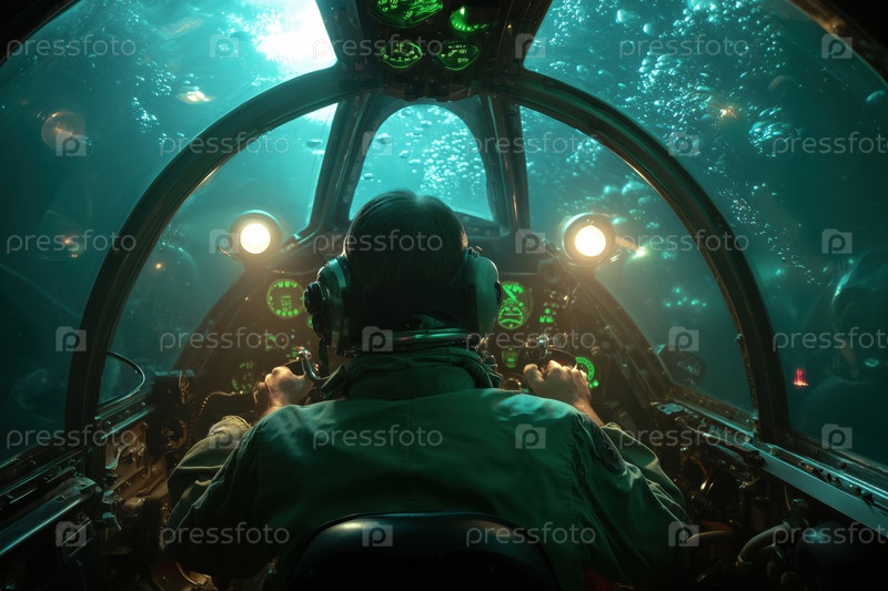 Мужчина средних лет пилотирует подводную лодку Под водой в кабине взглянуть