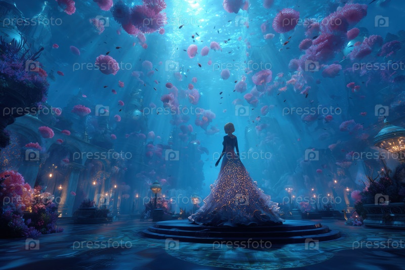 Молодая женщина стоит под водой в окружении плавучей медузы