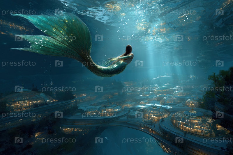 Фантастическая русалка плавает над футуристическим подводным городом, освещающим сцену