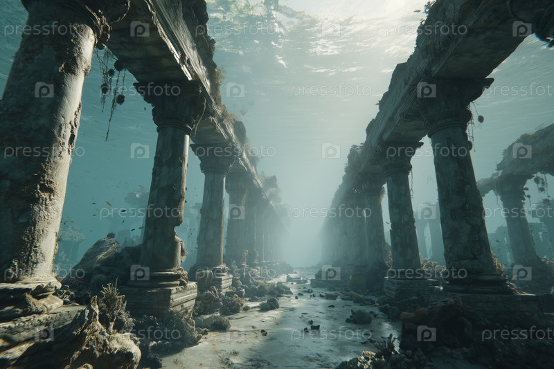 Древние каменные колонны погрузились под воду с рыбой, плавающей вокруг руин