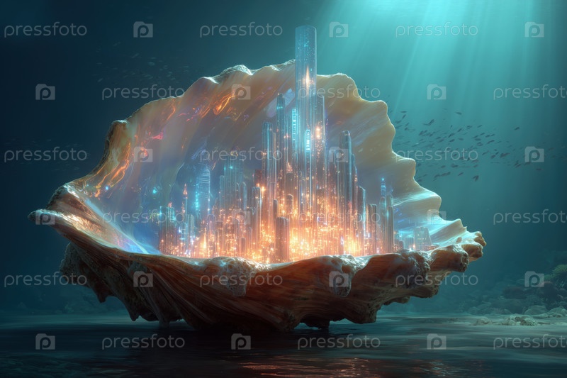 Футуристический подводный город, выходящий из гигантской раковины в Ocean Fantasy Scene