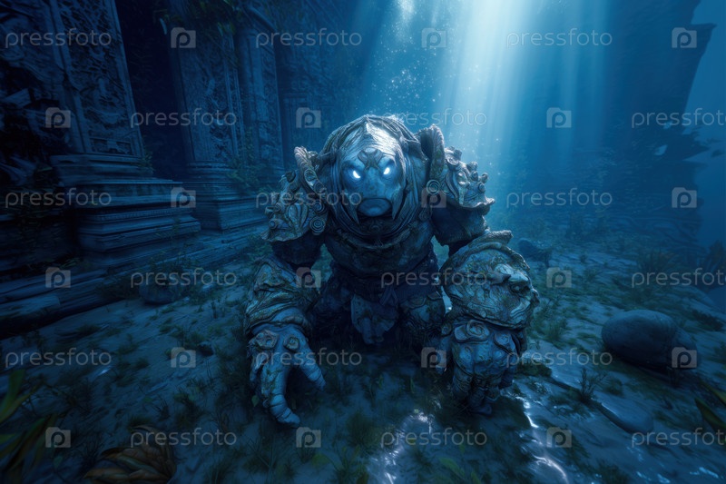 Древний роботизированный голем исследует подводные руины в таинственном свете