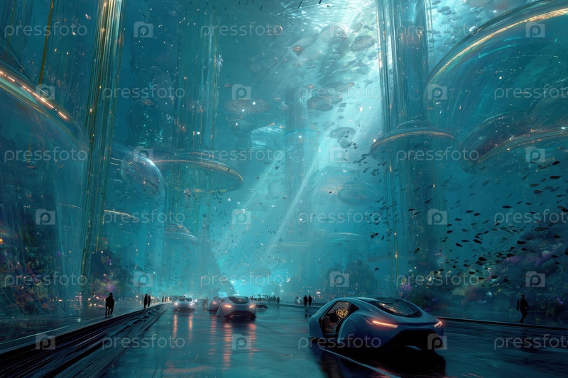 Футуристические мультиэтнические люди ходят и ездят на автомобилях в подводном городском пейзаже