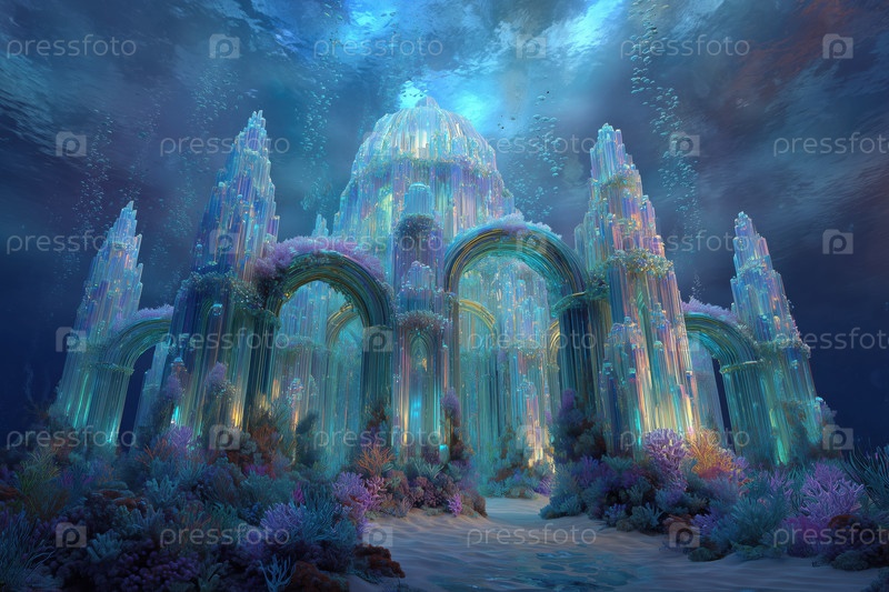 Фантастический подводный кристаллический дворец, окруженный красочными кораллами и морской жизнью