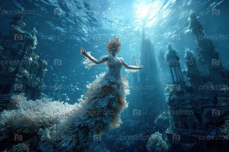Молодая взрослая женщина плавает под водой среди древних руин