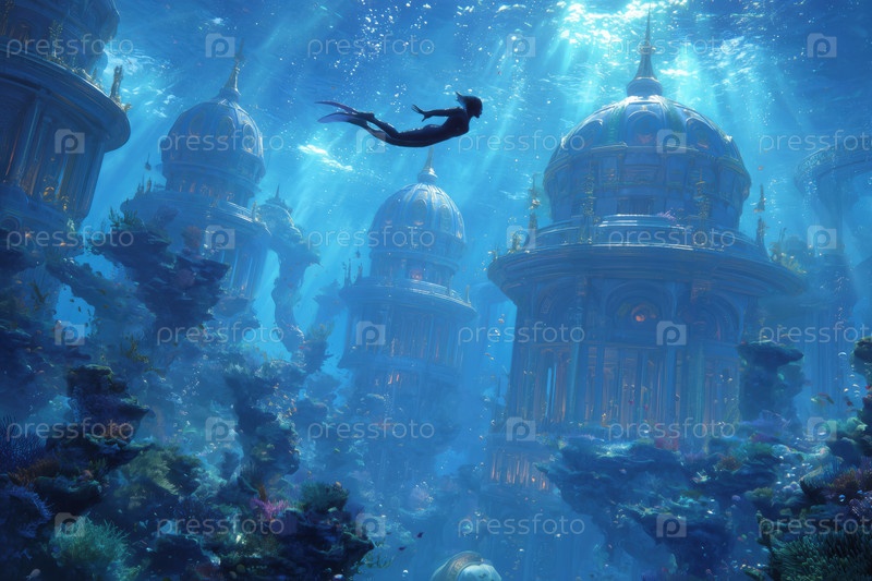 Молодая взрослая женщина плавает под водой возле древних руин в фантастической сцене
