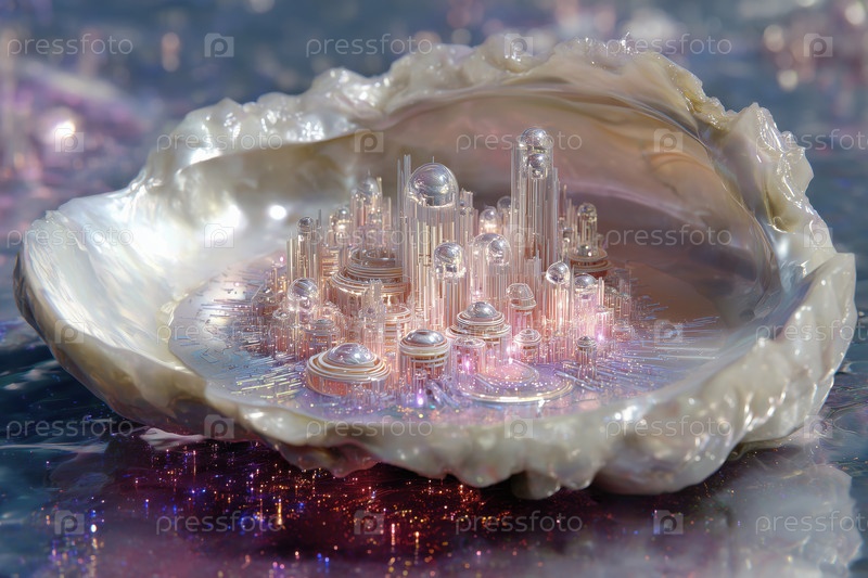 Futuristic Miniature City Emerging Inside Iridescent Seashell on Shimmering Surface (Футуристический миниатюрный город, появляющийся внутри радужной раковины на сверкающей поверхности)