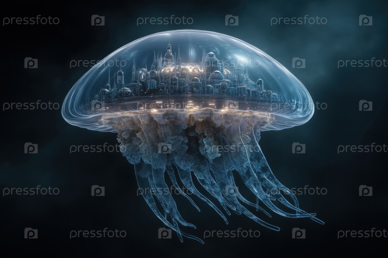Футуристическая структура в форме медузы, плавающая в темной атмосферной среде