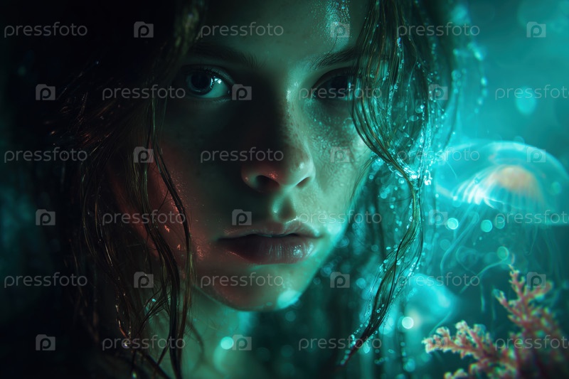 Портрет девочки-подростка, глядящей под водой в окружении медуз