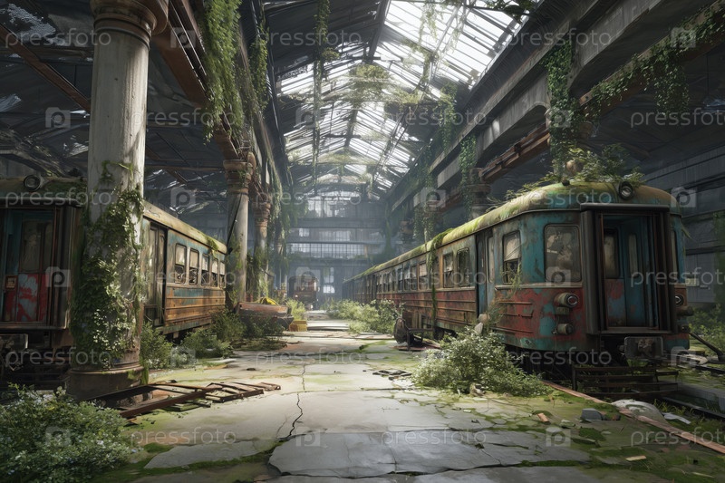 Заброшенные вагоны поезда, переросшие растительностью в солнечном промышленном депо
