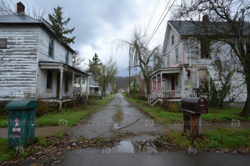 Заброшенная жилая улица с выветрившимися домами после дождей