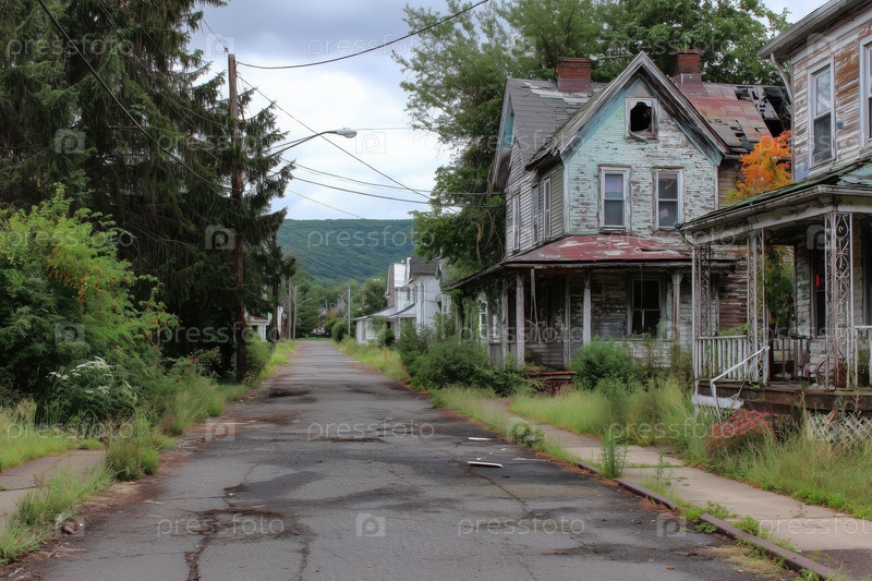 Заброшенная жилая улица с разрушенными домами и переросшей растительностью