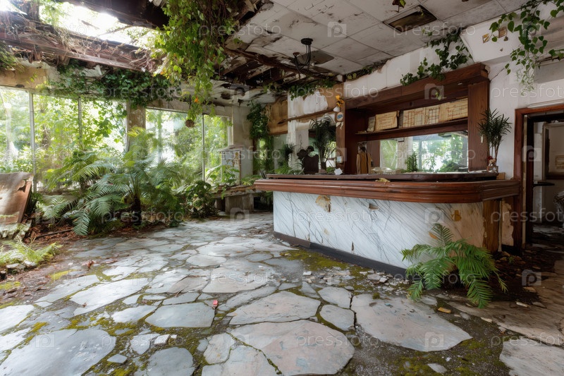 Заброшенное гостиничное лобби перерастает пышной зеленью и естественной растительностью