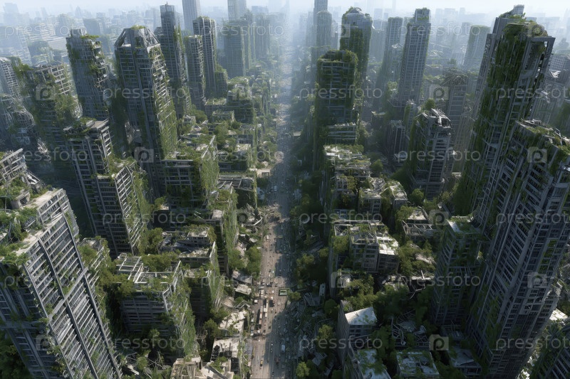 Заброшенный городской пейзаж с заросшими небоскребами и пустыми улицами