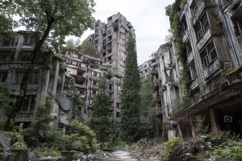 Заброшенные городские здания, переросшие растительностью в разлагающемся центре города