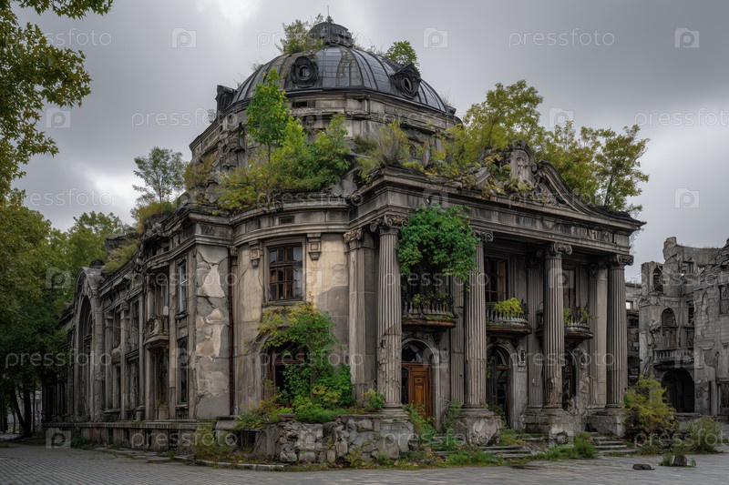 Заброшенное историческое здание, переросшее растительностью в городской среде