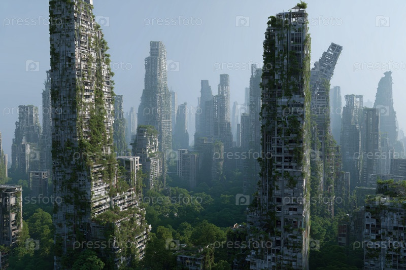 Заброшенные небоскребы, переросшие растительностью в постапокалиптическом городском ландшафте