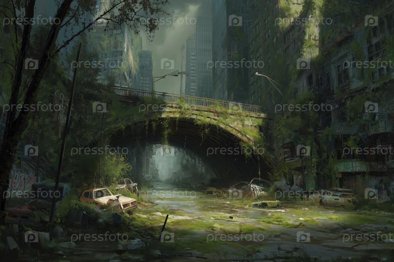 Заброшенный городской мост, переросший растительностью в постапокалиптическом городе