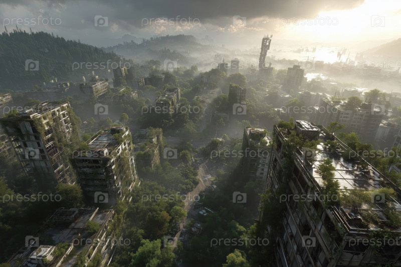 Переросшие заброшенные городские здания, окруженные пышной растительностью на восходе солнца