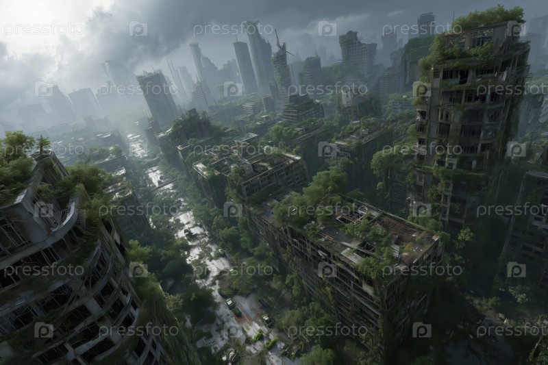 Заброшенный городской пейзаж перерос растительностью после отъезда человека