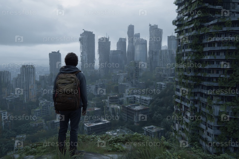 Подросток исследует переросшие городские руины в пост-апокалиптическом городском ландшафте