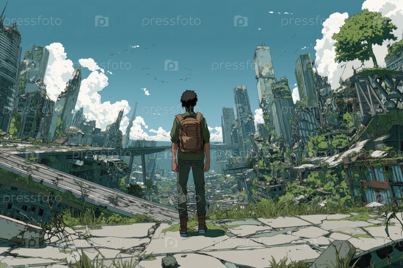 Подросток, стоящий один с видом на переросший пост-апокалиптический городской пейзаж