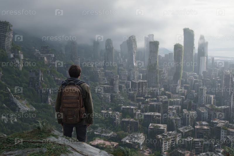 Молодой взрослый мужчина наблюдает за перерастающим пост-апокалиптическим городом с холма