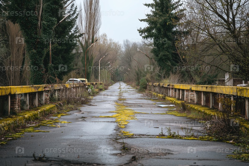 Заброшенная заросшая дорога тянется через лес в пасмурный день