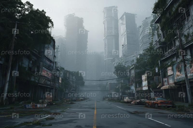 Заброшенная городская улица с переросшей растительностью в постапокалиптическом городском ландшафте