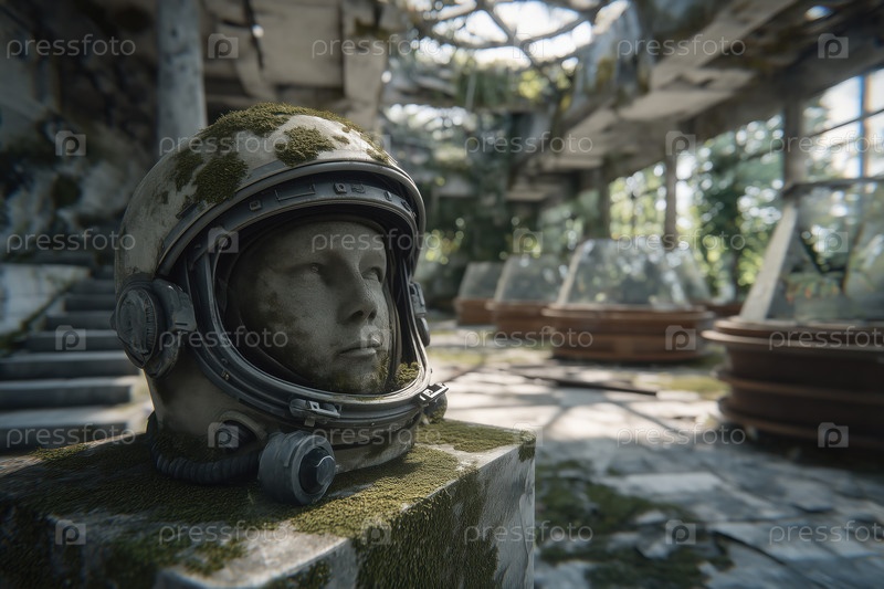 Скульптура шлема астронавта, выставленная в заброшенном каменном здании