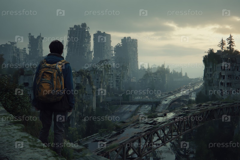 Подросток стоит на разрушенном мостовом переходе, изучая пост-апокалиптический городской пейзаж