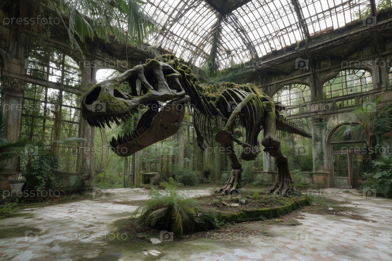 Скелет динозавра стоит в переросшей заброшенной стеклянной консерватории