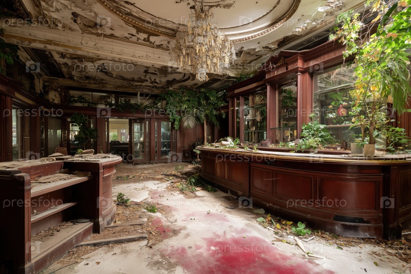Заброшенное лобби Большого отеля показывает гниение и перерастающую растительность в помещении