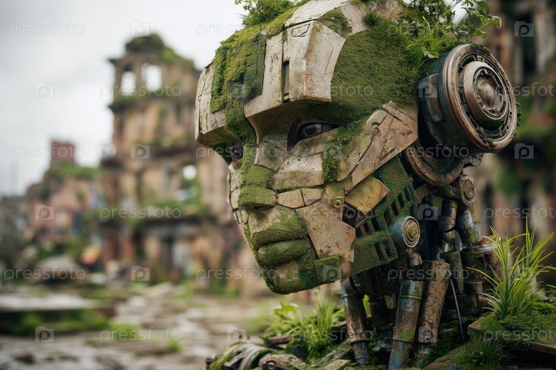 Футуристический гуманоидный робот, покрытый мхом, стоит в постапокалиптических руинах