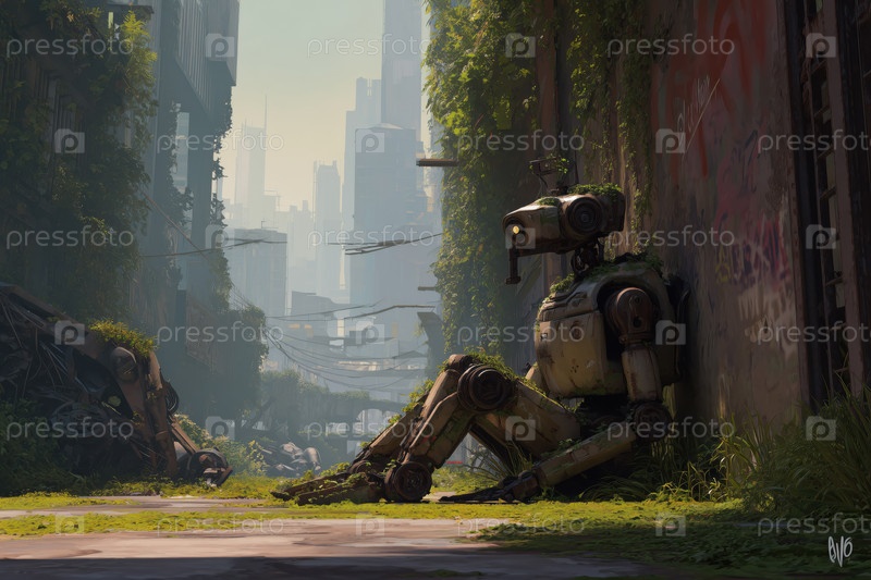 Одинокий робот сидит на стене в переросшем пост-апокалиптическом городе