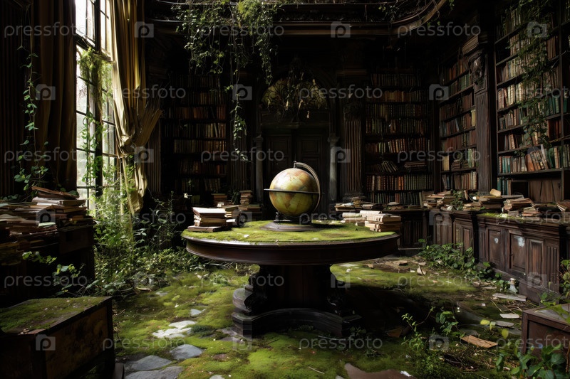 Заброшенный библиотечный интерьер с мохообразным столом и переросшими книжными полками