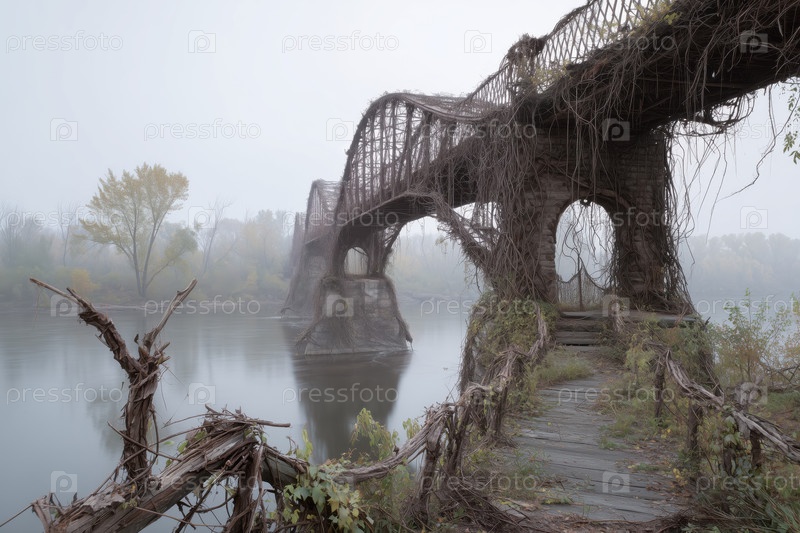 Заброшенный мост, покрытый переросшими лозами, охватывающими ландшафт туманной реки