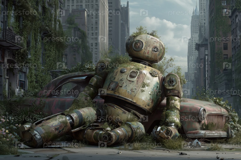 Рыжий робот сидит среди заброшенных автомобилей в переросших городских руинах