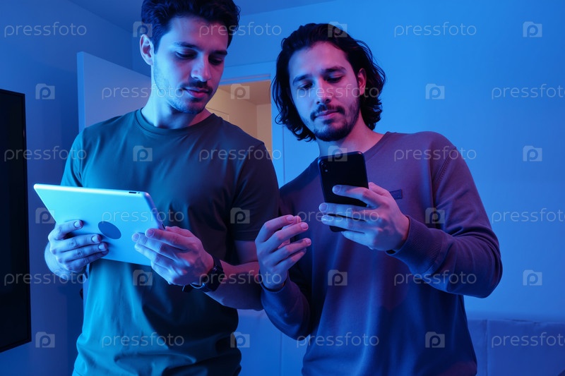 Молодые взрослые мужчины сотрудничают с помощью планшета и смартфона в помещении